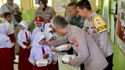 Polsek Cisayong, Polres Tasikmalaya Kota, Jawa Barat kali kedua membagikan makan sehat bergizi untuk anak Sekolah Dasar Negeri (SDN) Sindangsari, Desa Sukajadi.