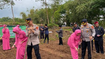Kapolres Tasikmalaya Kota, AKBP Moh. Faruk Rozi beserta Ketua Bhayangkari melakukan penanaman jagung pada Program Ketahanan Pangan di Wilayah Kecamatan Sukahening, Kabupaten Tasikmalaya.