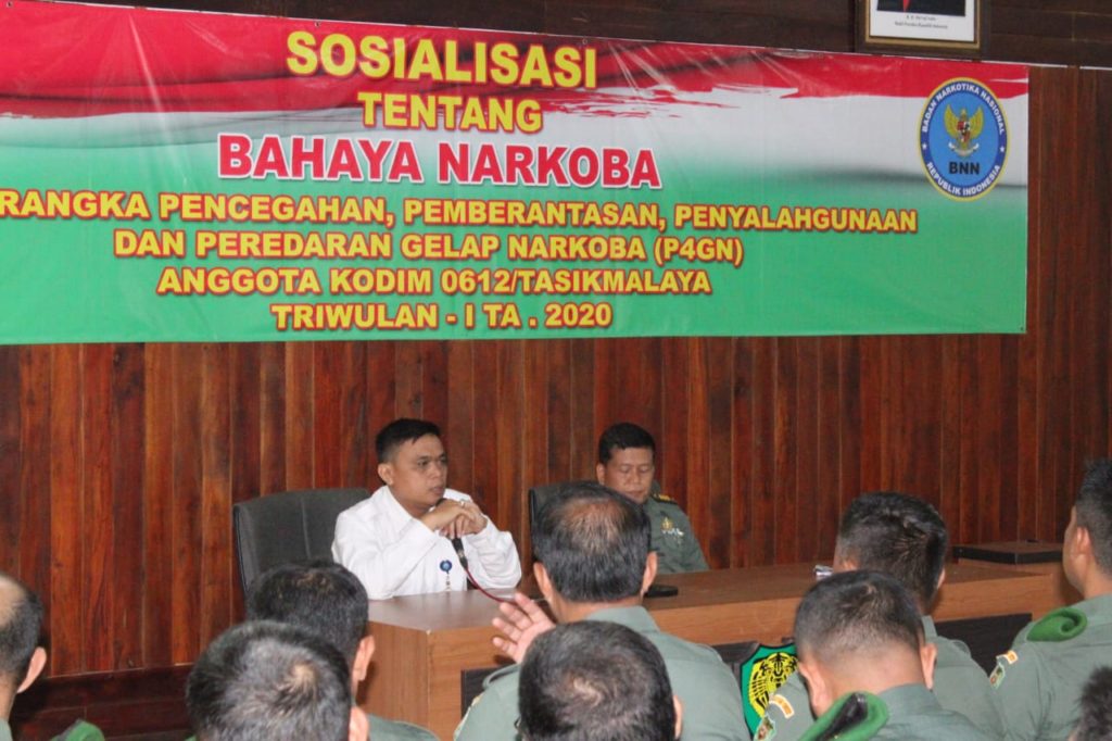 Tasikmalaya – Kodim 0612/Tasikmalaya melakukan Sosialisasi tentang bahaya Narkoba dalam rangka Pencegahan, Pemberantasan, Penyalahgunaan dan Peredaran Gelap Narkoba (P4GN), anggota Kodim 0612/ Tasikmalaya Triwulan I tahun 2020, Senin (10/02/2020), bertempat di Aula Makodim 0612/Tasikmalaya Jl. Otto Iskandardinata No.11 Kelurahan Empangsari, Kecamatan Tawang, Kota Tasikmalaya.