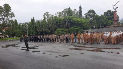 Ratusan Aparatur Sipil Negara, TNI, Polri dan Organisasi Kemasyarakat serta Organisasi Kepemudaan ikuti Apel di Lapangan Kantor Bupati Tasikmalaya.