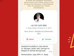 Maraknya aksi penipuan mencatut nama dan foto Wakil Bupati Tasikmalaya H Asep Sopari Al-Ayubi melalui pesan aplikasi WhatsApp. Masyarakat Kabupaten Tasikmalaya diimbau untuk meningkatkan kewaspadaan.