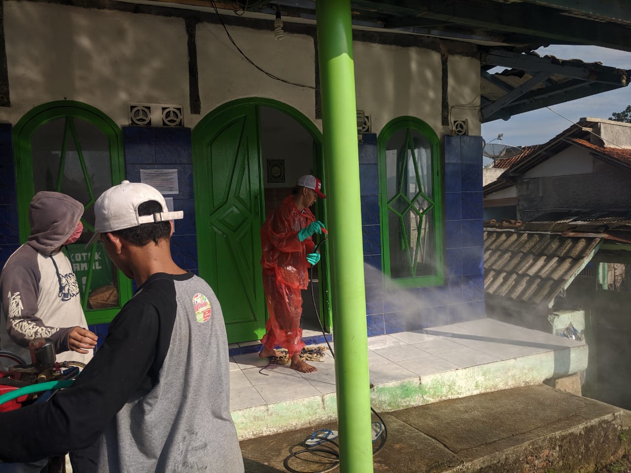 Kabupaten Tasikmalaya – Pemuda Kampung Cibodas Pintu gelar aksi sosial dengan penyemprotan Disinfektan keliling ke semua Rumah-rumah warga, Pos Ronda, Sekolah Dasar, TK, Mushola, Masjid Jamie dan Madrasah, serta tempat-tempat lainnya yang ada di Wilayah Desa Mekarwangi, Kecamatan Cisayong, Kabupaten Tasikmalaya, Sabtu (04/04/2020)
