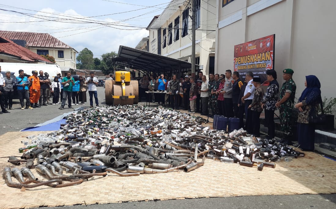 Selain Miras yang dihancurkan, Polres Tasikmalaya juga memusnahkan 200 knalpot bronk hasil penyiataan dari pengendara yang nakal.
