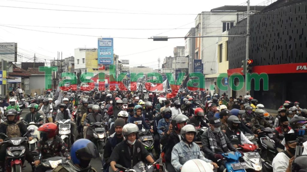 Ribuan Umat Muslim Tasikmalaya gelar unjuk rasa bela Nabi Muhammad SAW atas penghinaan Presiden Prancis, aksi dimulai di depan Masjid Agung Tasikmalaya kemudian dilanjut longmarch ke Jln. H.Z Mustofa, Kamis (4/11/2020).